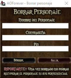 Para borrar un personaje en Argentum Online Forever, debes abrir el juego y desde la misma ventana donde te conectas te aparecerá una opción que se llama "Borrar Personaje" al hacer click se abrirá una ventana como esta: